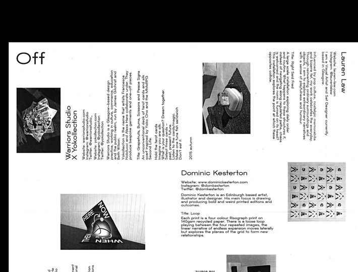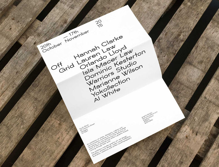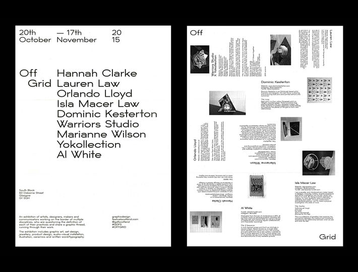 Off Grid features interdisciplinary artists and graphic designers in an exhibition that was originally shown at South Block Glasgow as part of Graphic Design Festival Scotland 2015 before being invited to Nancy, France, where it was shown at Galerie My Monkey.