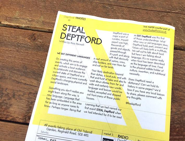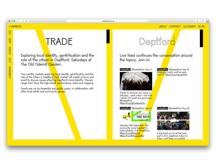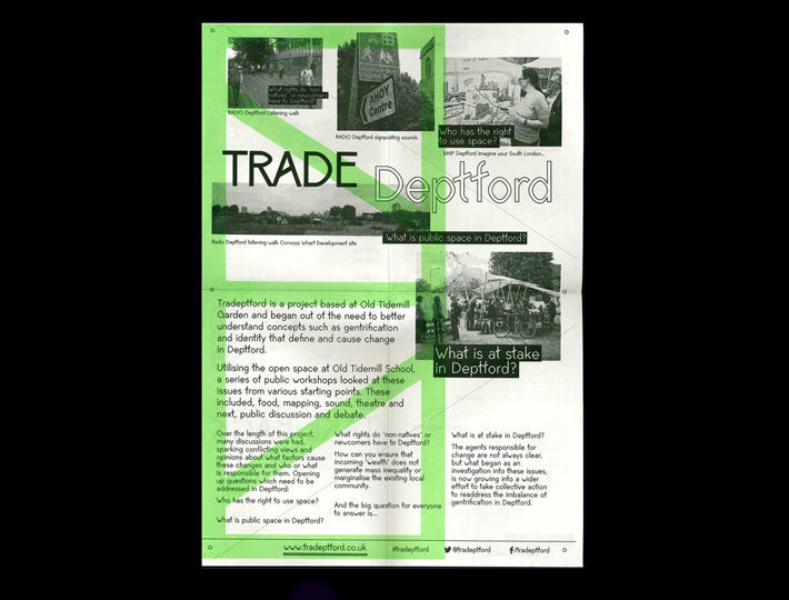 Tradeptford provided a local platform hosting events and debates. It aimed for a new typology of market forum which would turn the artist/architect into a lever for positive social change. Through the direct participation in each forum, local residents worked together with local artists and designers to unpick the impact of gentrification in Deptford.